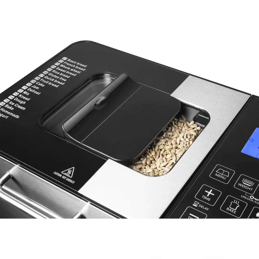 • Skvělými vychytávkami jsou posuvný kryt pro přidávání ořechů nebo jiných ingrediencí při provozu, odložený start a funkce udržování teploty až 60 minut.