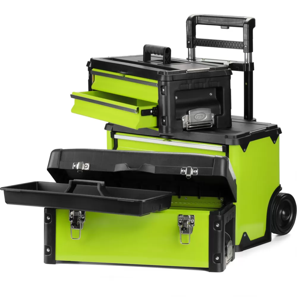 V menších přihrádkách ve víku horního boxu uložíte drobný, např. spojovací materiál, o kterém budete mít perfektní přehled díky krytu z průhledného pevného plastu. Vyjímatelná plastová přihrádka s rukojetí pak pojme další drobnosti a nářadí a v boxu zbyde ještě dost prostoru na větší nástroje.