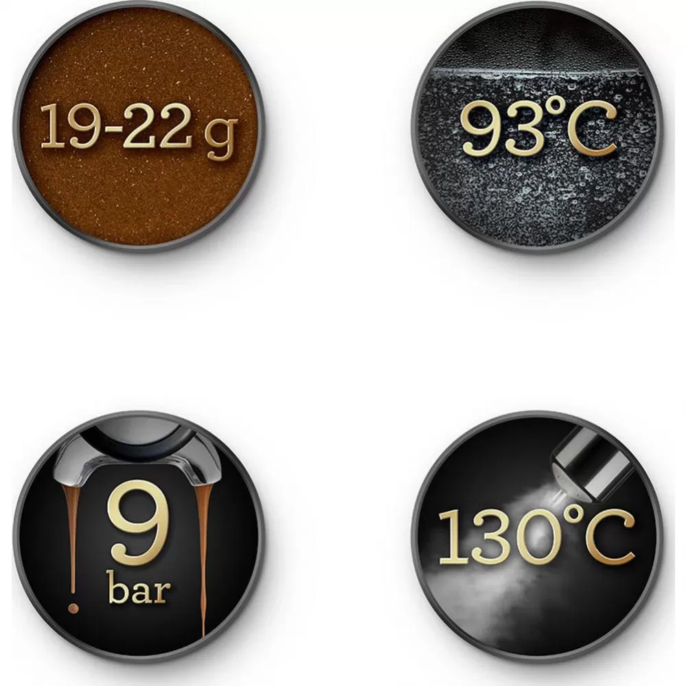 Elektronický systém kontroly teploty zajišťuje stálou teplotu během extrakce kávy (+/-1°C)