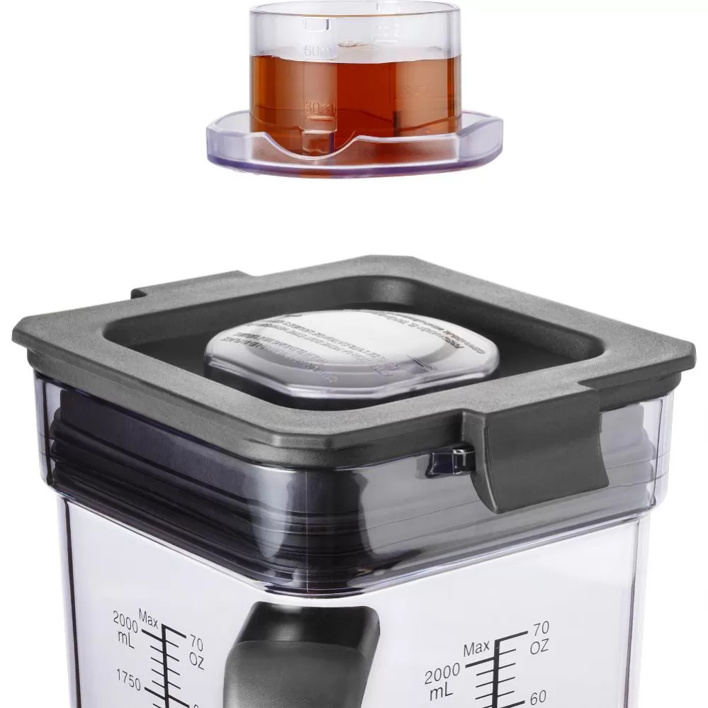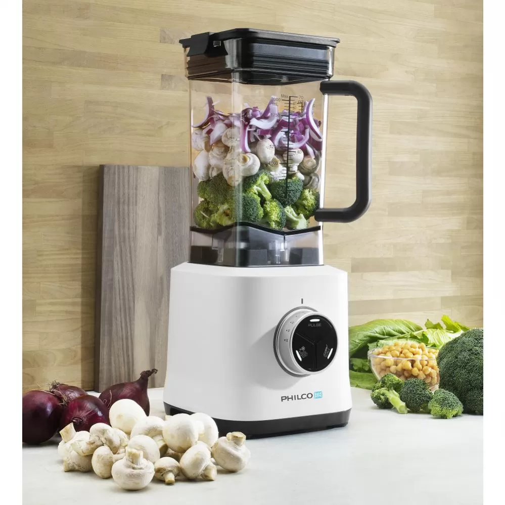 Velká nádoba s objemem až 2 litry má držadlo z měkkého plastu pro pohodlné uchopení a bezpečné přenášení, i když je plná a těžká. Je také vyrobena ze zdravotně nezávadného materiálu PCTG bez BPA a má dobře čitelný vodoznak. Mixér má plynulou regulaci výkonu, konstantní nastavení rychlosti a 3 programy na smoothie, led a okamžité zvýšení výkonu Puls, dále ocelové převody a praktický hranatý tvar. To vše z něj dělá titána, který si poradí se všemi surovinami a bude vám dlouho spolehlivě sloužit.