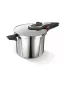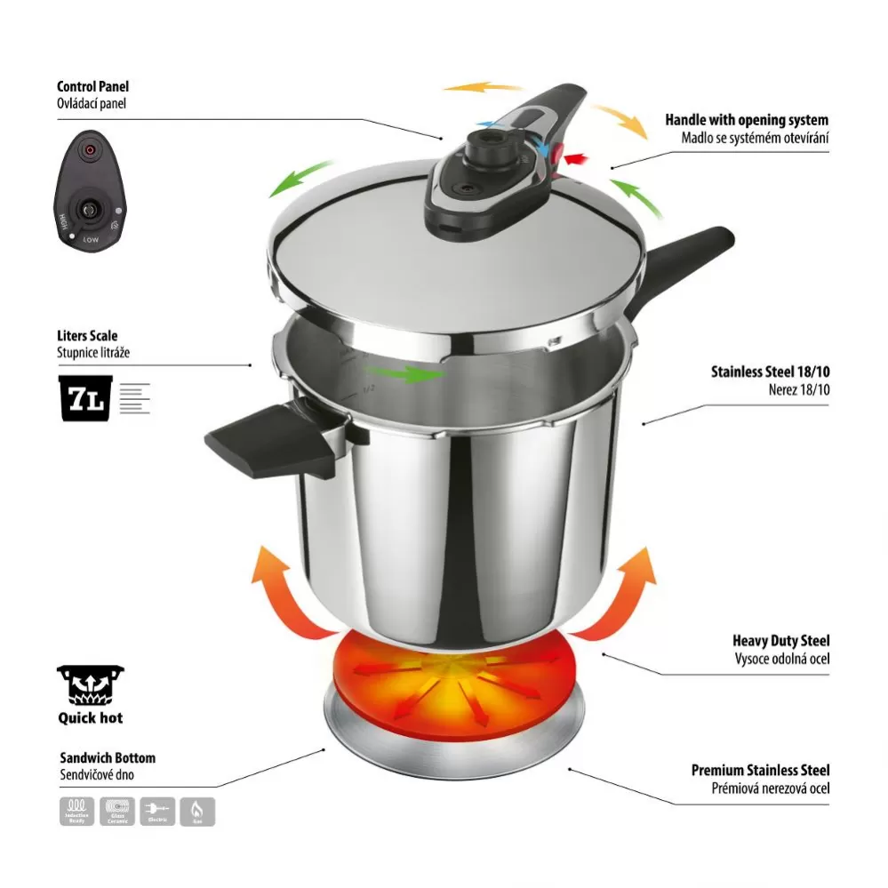 Čtyři pojistky, indikátor tlaku a dvojí bezpečnostní ventil zajišťují maximální bezpečnost při vaření. Sendvičové dno umožňuje rovnoměrné rozložení tepla, což zkracuje dobu vaření a šetří energii. Moderní design hrnce dodá vaší kuchyni elegantní vzhled.