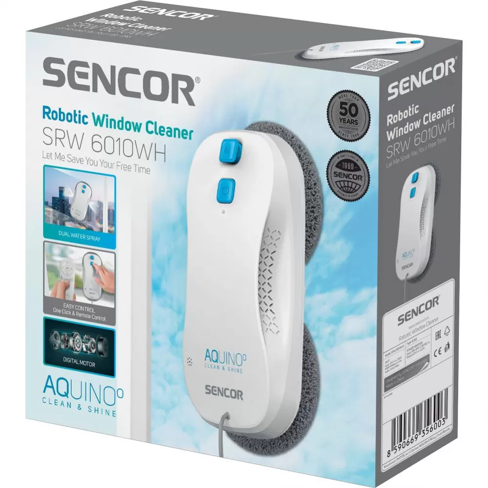 Užívejte si perfektně čistá okna každý den bez námahy s robotickým čističem Sencor SRW 6010WH Aquino, který udělá veškerou práci za vás. Robot se bezpečně přisaje na okno silným podtlakem 3 000 Pa. O precizní mytí oken se postarají 2 rotační kotouče s vyměnitelnými polštářky z mikrovlákna.  Integrovaná nádržka na vodu a dvě ultrasonické trysky zajistí automatické namáčení skla. Jeho pohyb je řízen systematicky díky navigačnímu systému Sencor Smart Gyro, který detekuje rámy oken a nebo okraje u bezrámových ploch. Ovládáte jej jednoduše pomocí dálkového ovladače či přímo na jeho těle. Využít jej můžete také na zrcadla a jiné skleněné povrchy v celé domácnosti.